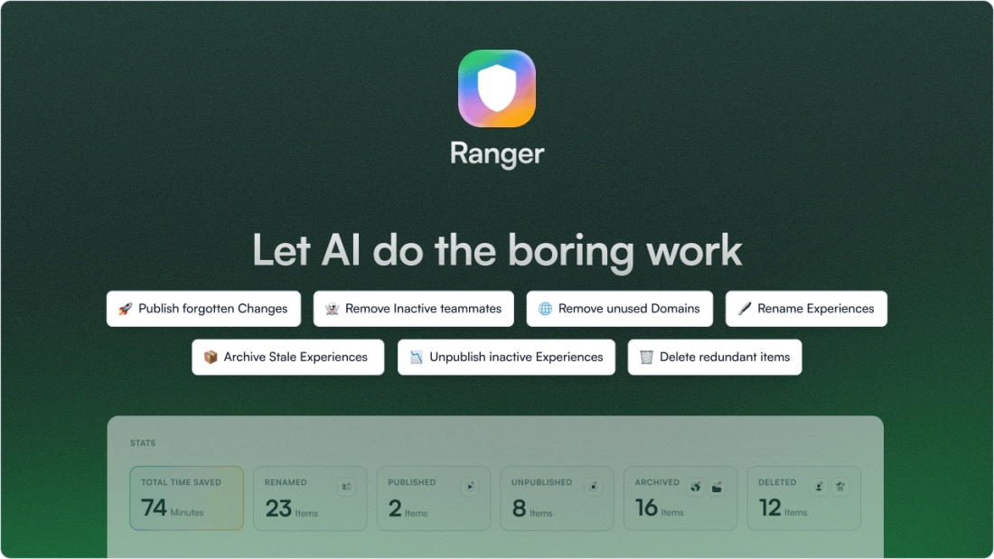 Ranger is Chameleon’s Governance Agent — it runs automated “jobs” to keep accounts healthy by detecting inactive teammates, redundant experiences, broken elements, and more, with human review and bulk actions.