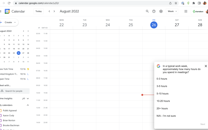 Google Calendar’s microsurvey is a quick and subtle way to gather user insights without disrupting the flow. It opens with a friendly prompt asking users to contribute to improving the tool, followed by an easy-to-answer question on meeting habits. The flow works well because it feels non-intrusive, with clear, straightforward questions that take only seconds to complete, helping Google fine-tune its services while keeping users engaged.
