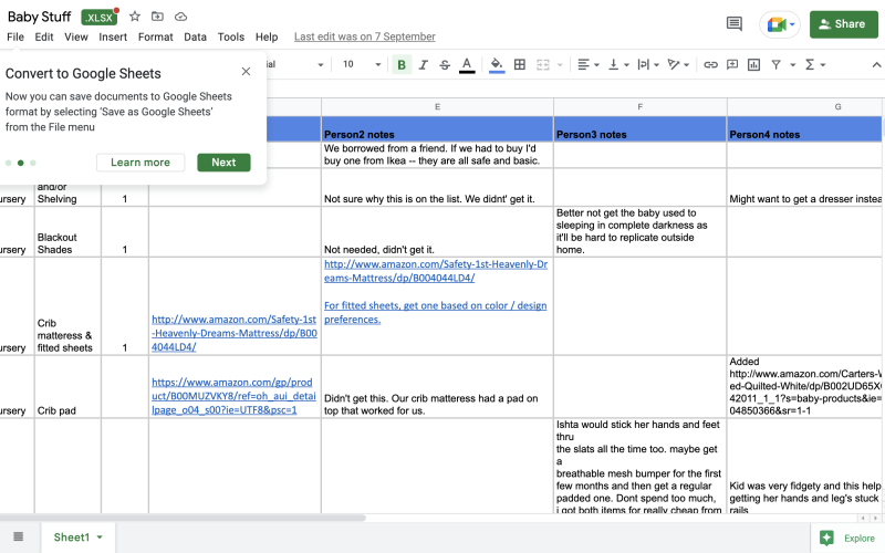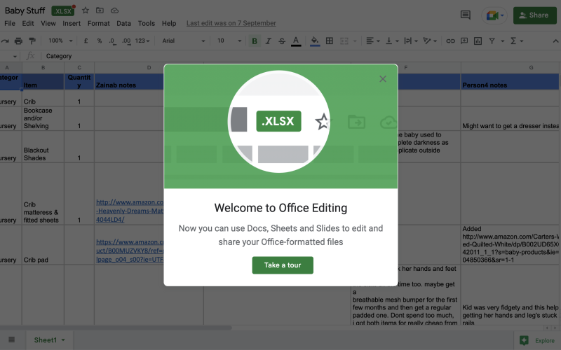 Google Sheets introduces its Office Editing feature with a helpful modal, allowing users to edit and share Office-formatted files directly in Docs, Sheets, and Slides. The tooltip provides a smooth step-by-step guide through key actions like converting files, viewing in Office format, and managing version history. This flow works well because it’s simple, clear, and guides users through powerful new options without overwhelming them, ensuring they can seamlessly handle Office files without needing external apps.