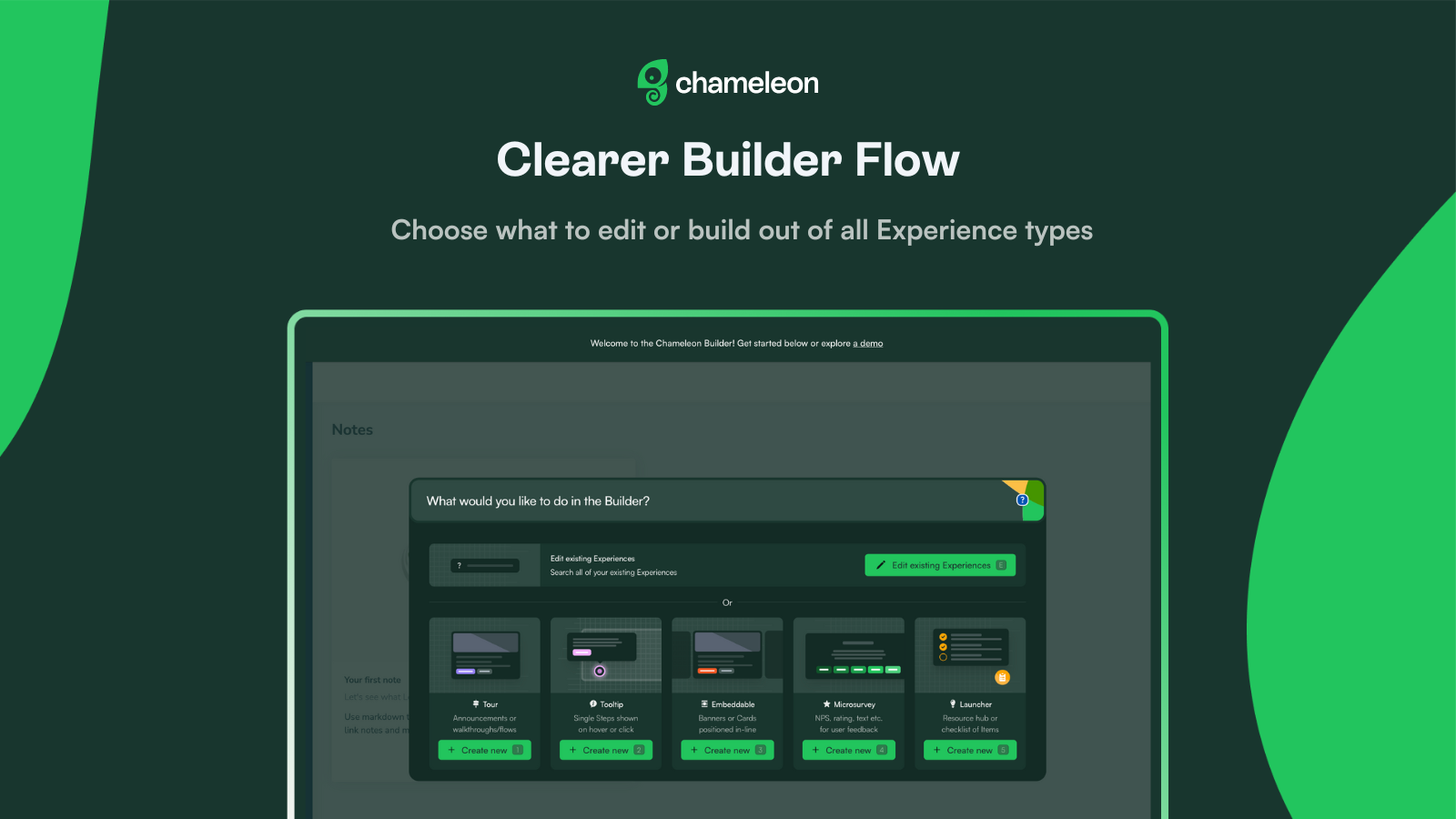 When you enter the Builder directly from the Chrome Extension, you can now pick to edit an existing Experience (find it via HelpBar and jump to configure it) or create a specific new type, by picking from all available patterns in Chameleon.