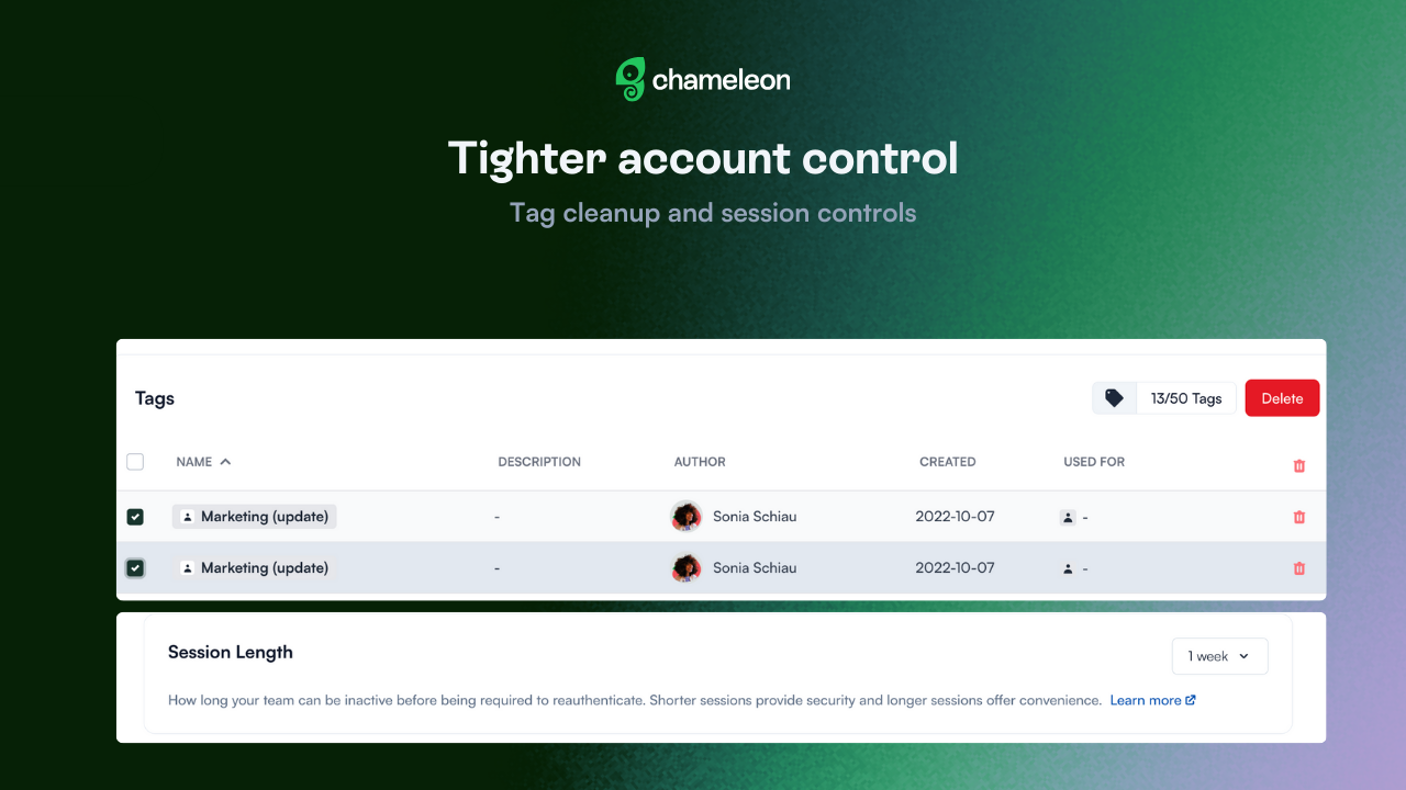 Admins can control session length for teammates logging into Chameleon. This helps teams reduce risk from long-running sessions, align with internal security policies, and keep access intentional, without disrupting day-to-day work.